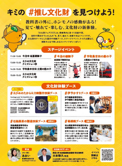 イベントスケジュール 2025/11/14 愛媛の たからもの を体験しよう!文化財フェア2025~キミが見つける、#推し文化財~11月29日(土)10:30~16:00エミフルMASAKI 恵美モール1Fグリーンコート参加無料のイベントです。愛媛の誇れる伝統がギュッと詰まってるイベントです。砥部焼に触れて学んで体験できるブースでは松山南高校砥部分校の生徒さんと一緒に出店します。皆様のご来場を心よりお待ちしております。 PDFを開く 文化財フェアinエミフルMASAKI