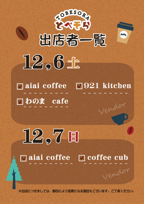 イベントスケジュール 2025/11/21 12月のイベントは!coffeeを楽しめるイベントです12月6日(土)・7日(日)11:00~17:00とべそらテラスにcoffee shopが集結します是非みなさまお立ち寄りください PDFを開く とべそらテラス coffeeフェス